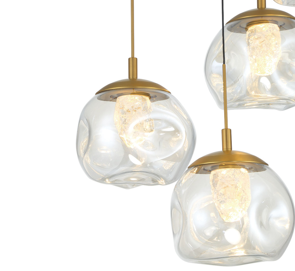 This dramatic light fixture showcases a cascading cluster of hand blown transparent glass globes, each one uniquely shaped with gentle, organic contours creating more reflection