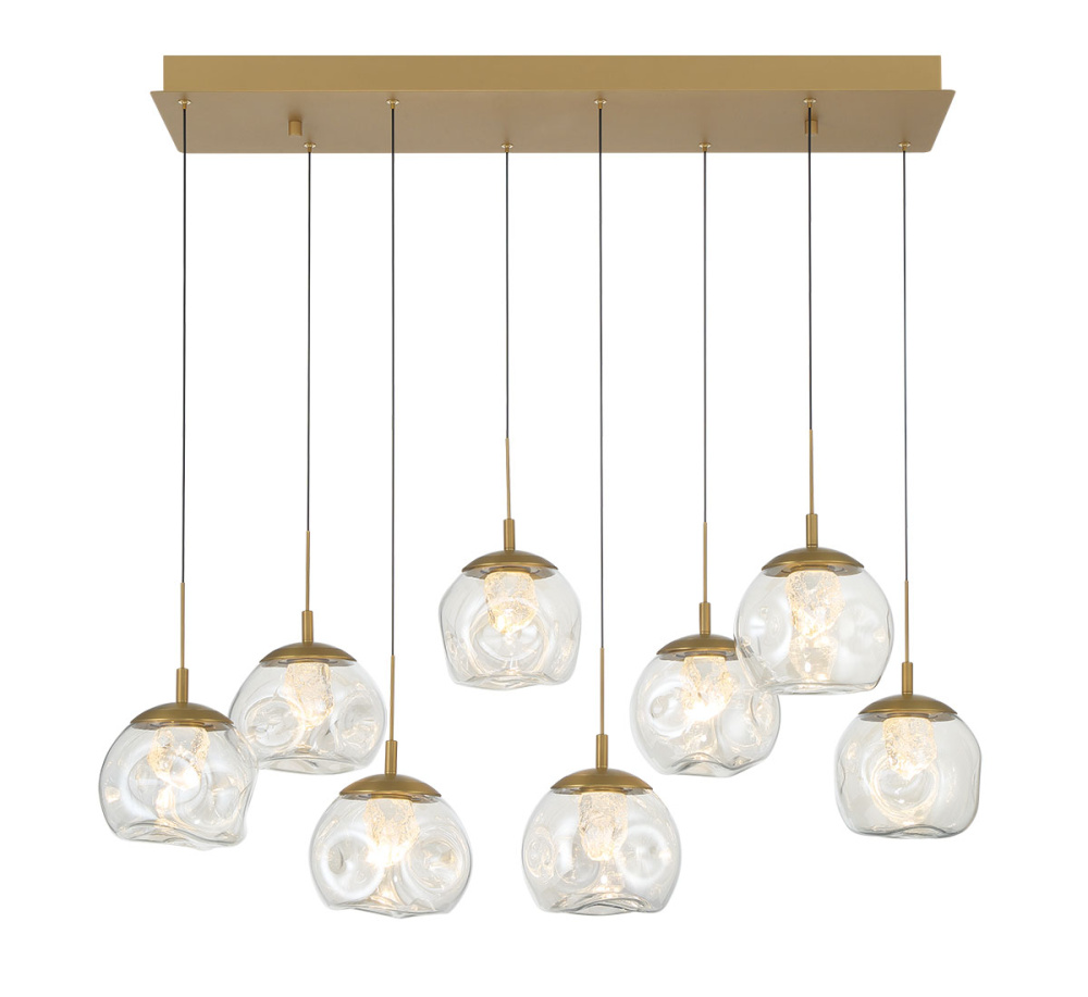 This dramatic light fixture showcases a cascading cluster of hand blown transparent glass globes, each one uniquely shaped with gentle, organic contours creating more reflection