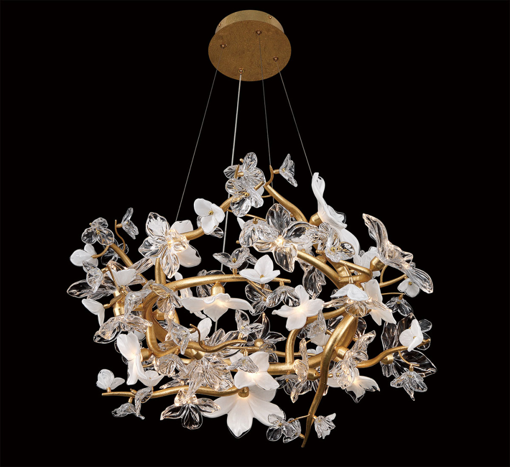 Scattered along these gold leaf branches are exquisitely detailed hand made glass blossoms in both frosted white and clear finishes, each petal delicately shaped to catch and diffuse the light.