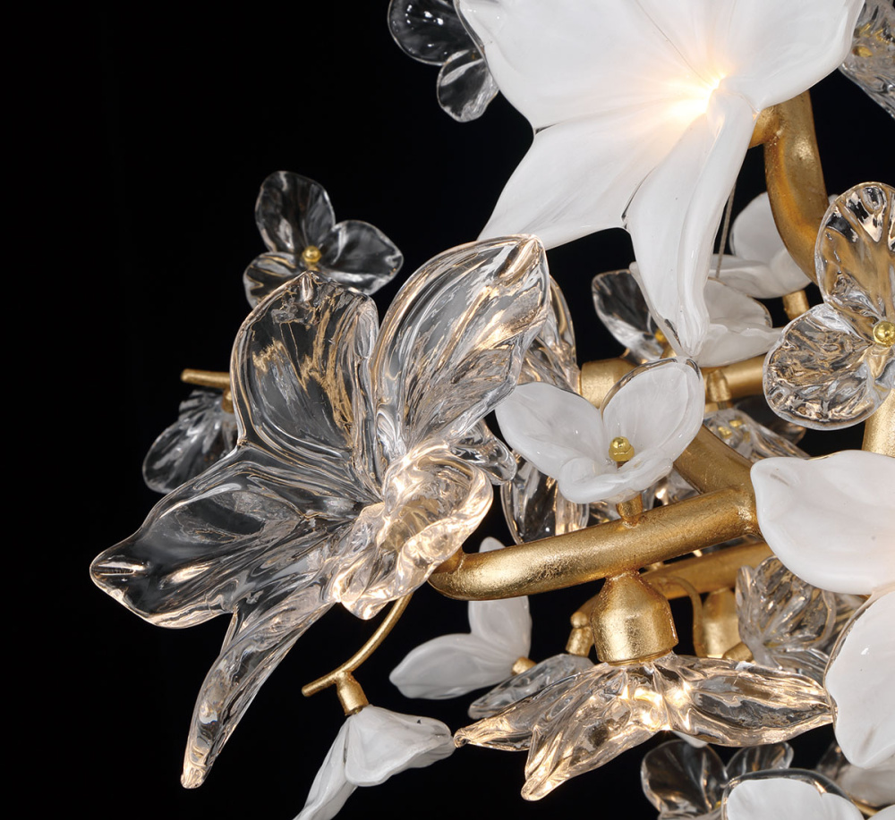 Scattered along these gold leaf branches are exquisitely detailed hand made glass blossoms in both frosted white and clear finishes, each petal delicately shaped to catch and diffuse the light.