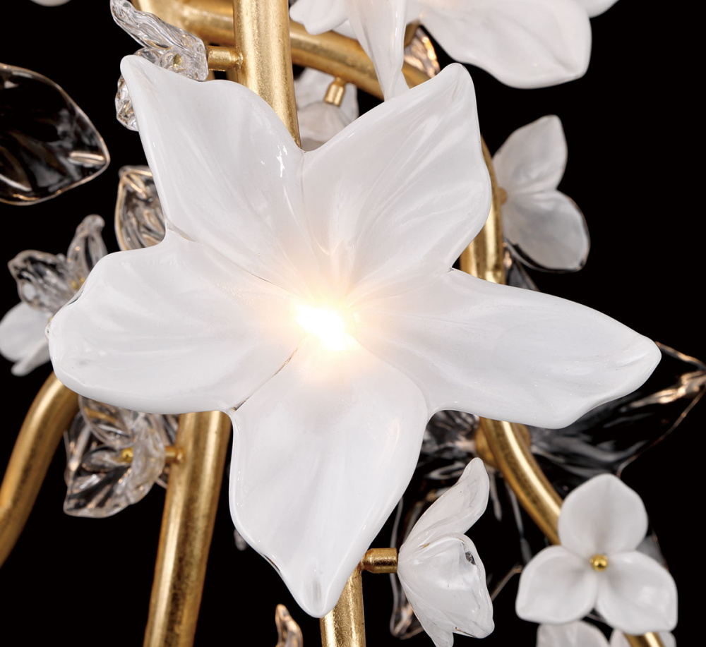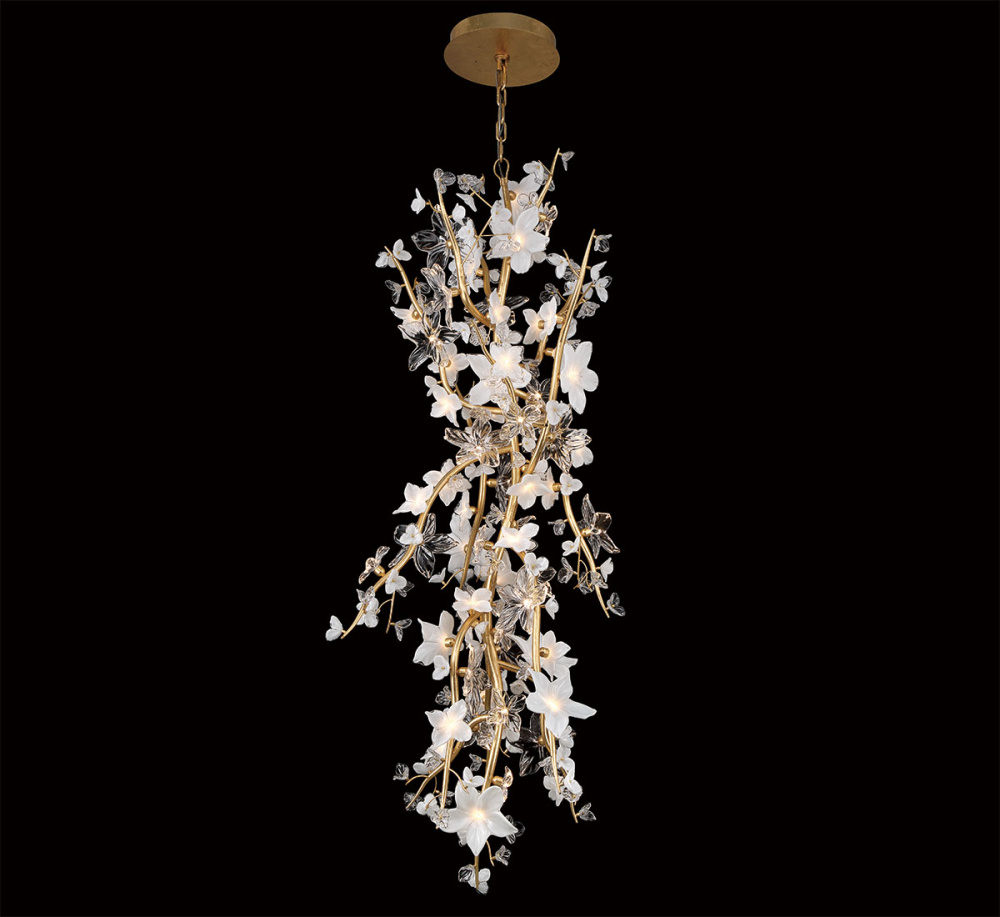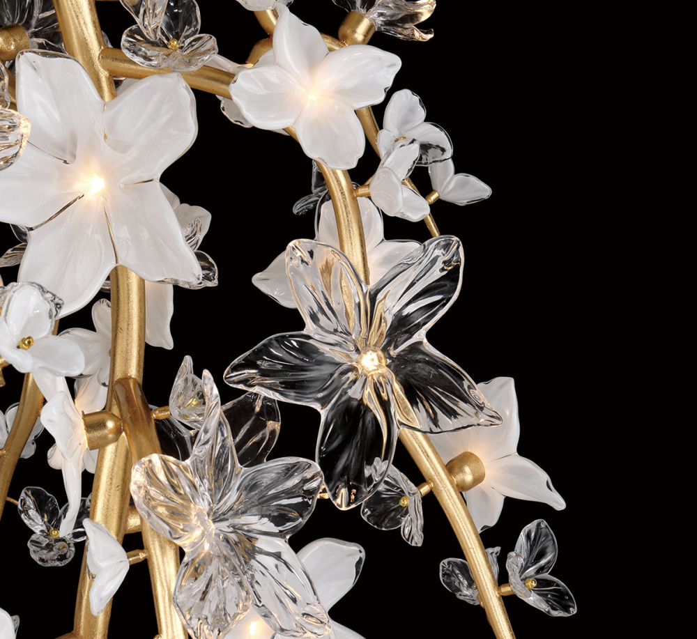 Scattered along these gold leaf branches are exquisitely detailed hand made glass blossoms in both frosted white and clear finishes, each petal delicately shaped to catch and diffuse the light.