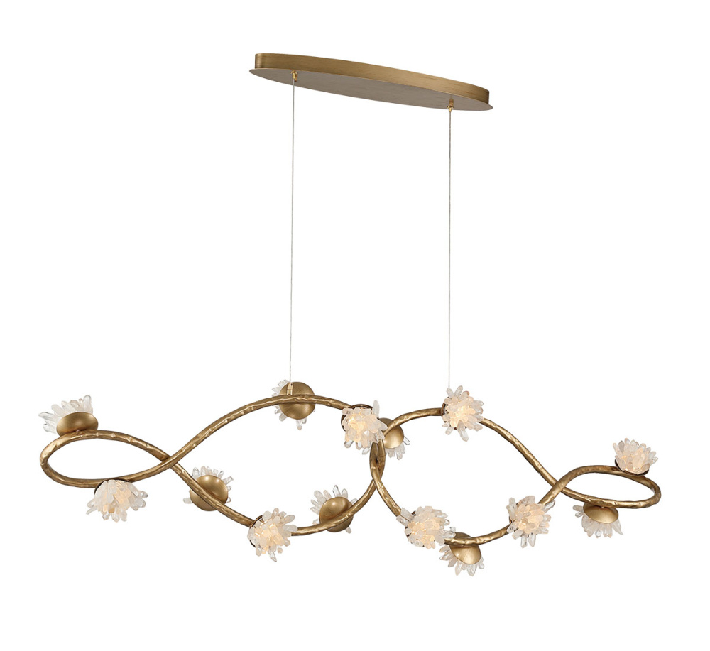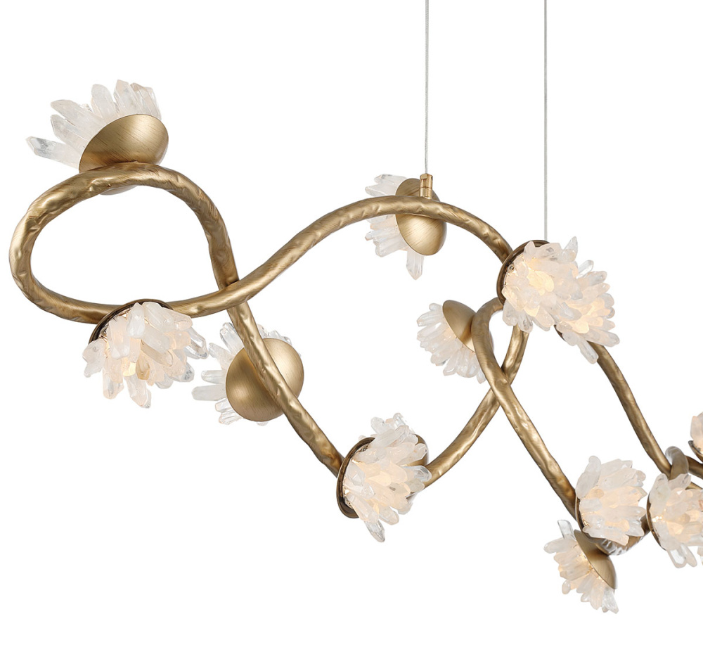 Along these curves, small sculptural blossoms made of clustered natural quartz crystal petals serve as the light sources, giving the piece a delicate, nature-inspired charm.