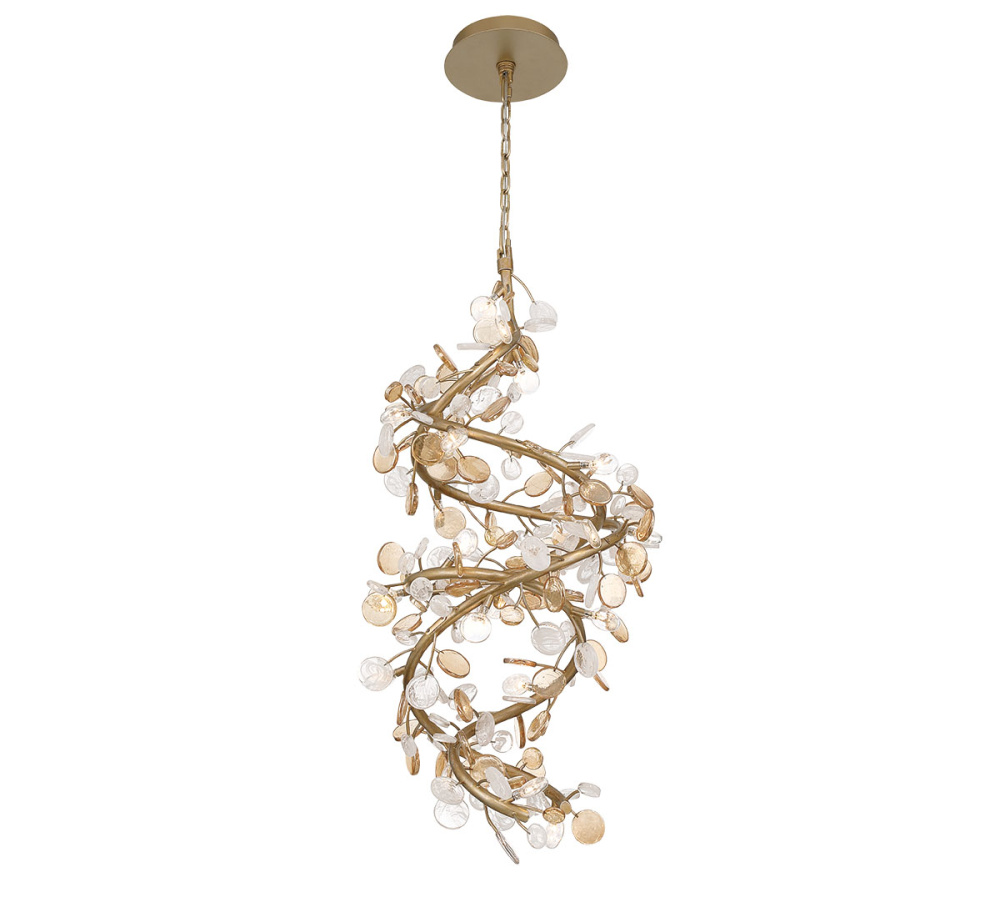 Handcrafted Piastra glass discs in rich cognac and clear tones create a luminous, artistic centerpiece.