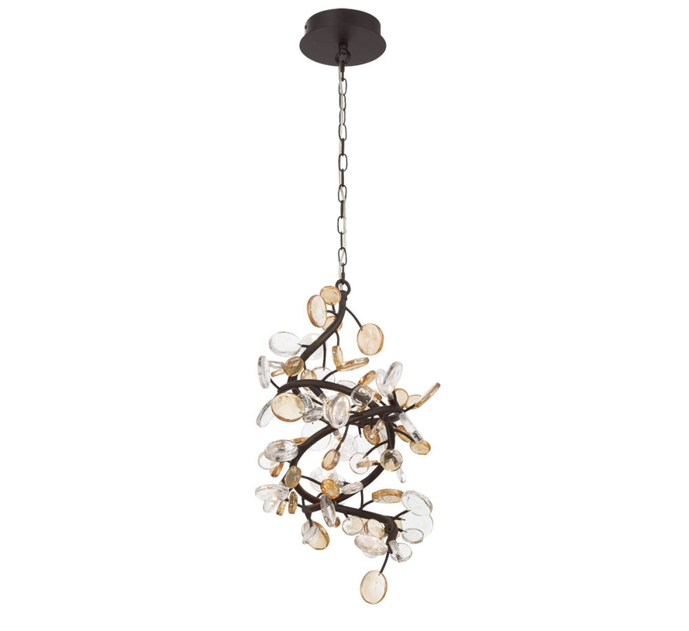 Handcrafted Piastra glass discs in rich cognac and clear tones create a luminous, artistic centerpiece.