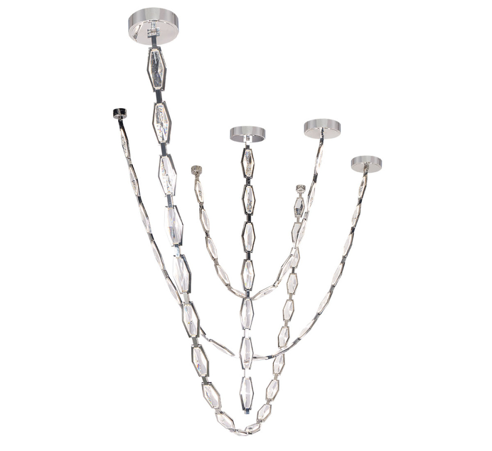 This fixture features a series of sweeping, arms made from linked, faceted crystal elements that create a shimmering, sculptural presence.