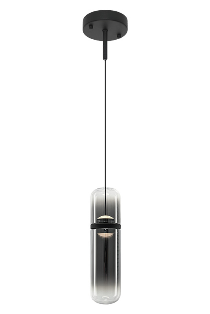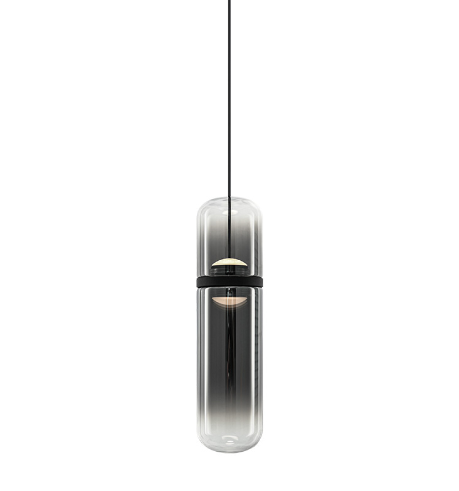Amulet Sleek sophistication meets sculptural luminosity in this modern pendant series. Each elongated glass capsule features a softly tinted center that transitions to clear glass at the top and bottom, creating a refined gradient effect and warm, atmospheric glow. The Champagne Gold finish pairs with amber-tinted glass, while the Matte Black finish pairs with smoked-tinted glass, each offering a distinct and contemporary expression. Suspended from a coordinating canopy, the pendants float gracefully, adding movement and visual interest to any space. Features a 5CCT switch inside the canopy to adjust the 5 selectable colour temperature