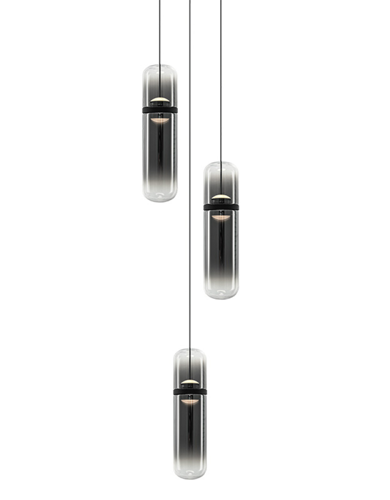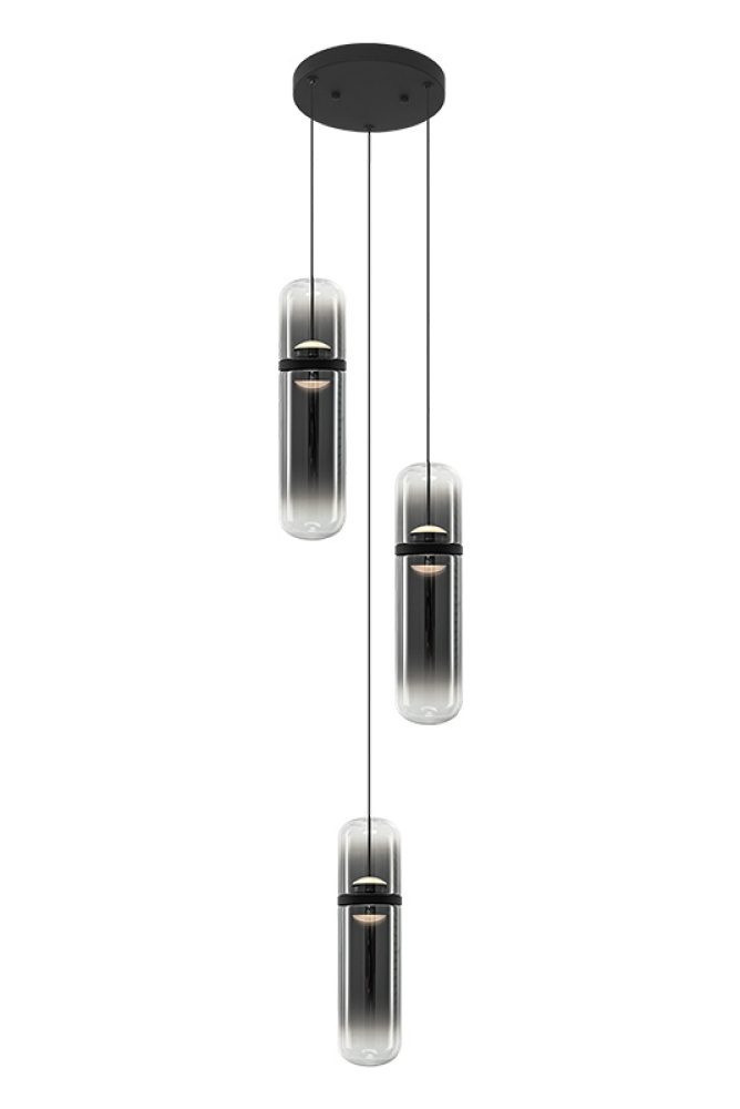Amulet Sleek sophistication meets sculptural luminosity in this modern pendant series. Each elongated glass capsule features a softly tinted center that transitions to clear glass at the top and bottom, creating a refined gradient effect and warm, atmospheric glow. The Champagne Gold finish pairs with amber-tinted glass, while the Matte Black finish pairs with smoked-tinted glass, each offering a distinct and contemporary expression. Suspended from a coordinating canopy, the pendants float gracefully, adding movement and visual interest to any space. Features a 5CCT switch inside the canopy to adjust the 5 selectable colour temperature