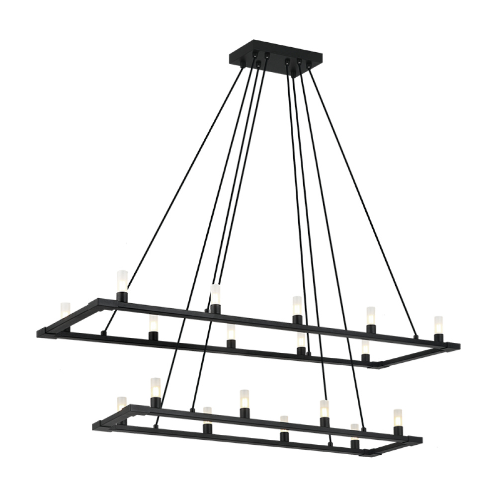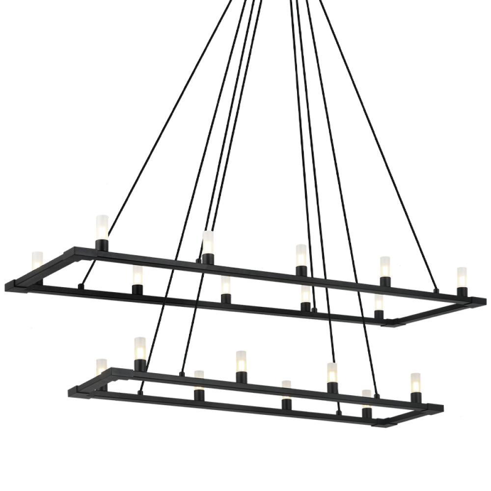 Need a statement piece – The Cascadian series will certainly deliver! Round and rectangular frames are both available and neither style will disappoint. Small glass shades line the Aged Gold Brass or Matte Black frame and are suspended by black fabric cords. Single layer and 2 two tier fixtures equally pack the WOW factor.