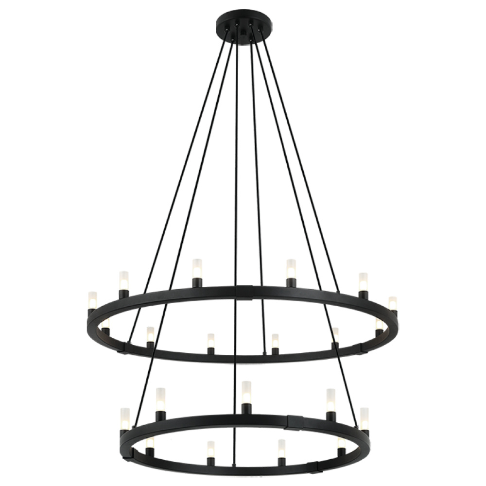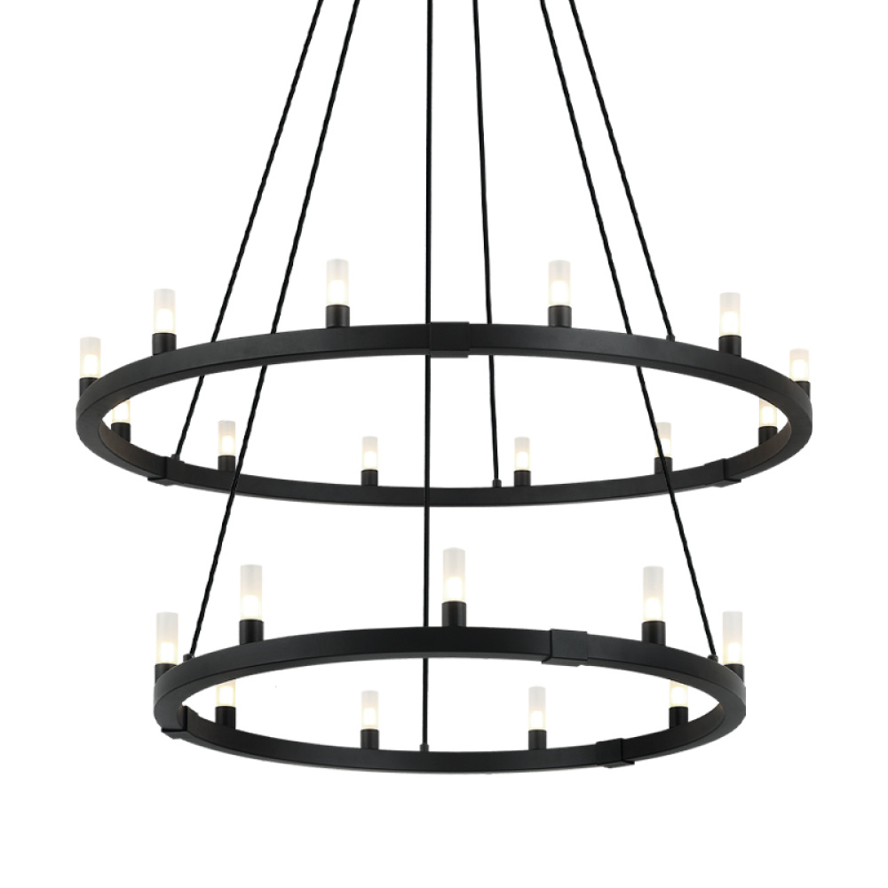 Need a statement piece – The Cascadian series will certainly deliver! Round and rectangular frames are both available and neither style will disappoint. Small glass shades line the Aged Gold Brass or Matte Black frame and are suspended by black fabric cords. Single layer and 2 two tier fixtures equally pack the WOW factor.