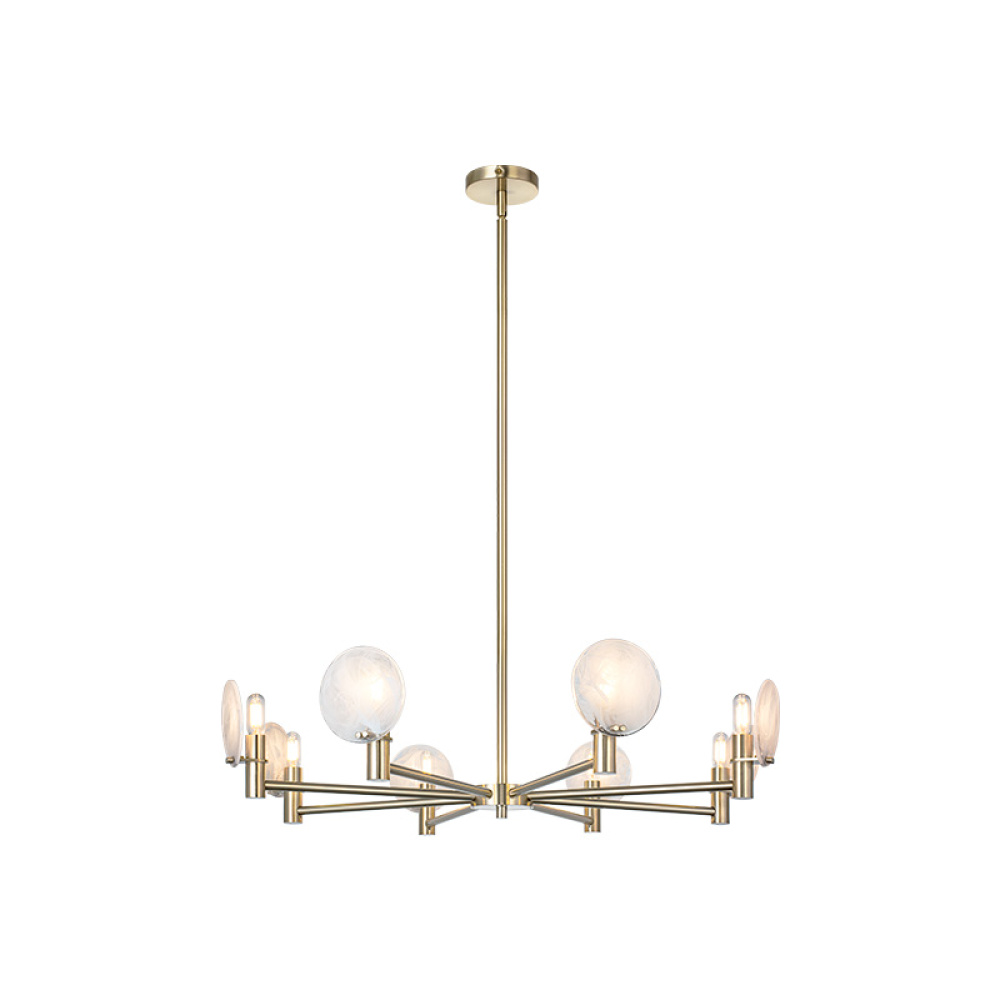 This chandelier blends mid-century modern with space-age sophistication ideal for upscale dining rooms,creative studios, or hospitality spaces aiming for an artistic edge.This can be shown with the light emitting up or down.The cloudy swirl glass gives it a soft touch to the design.