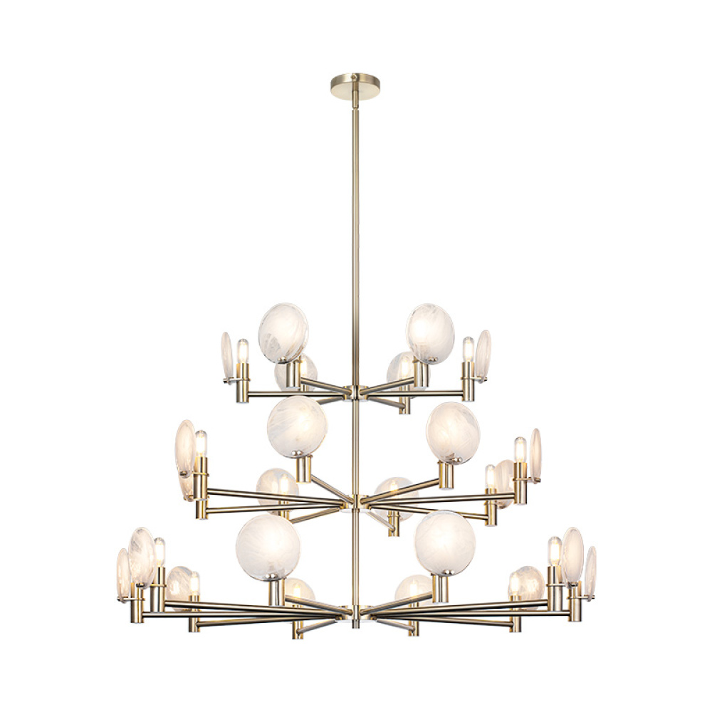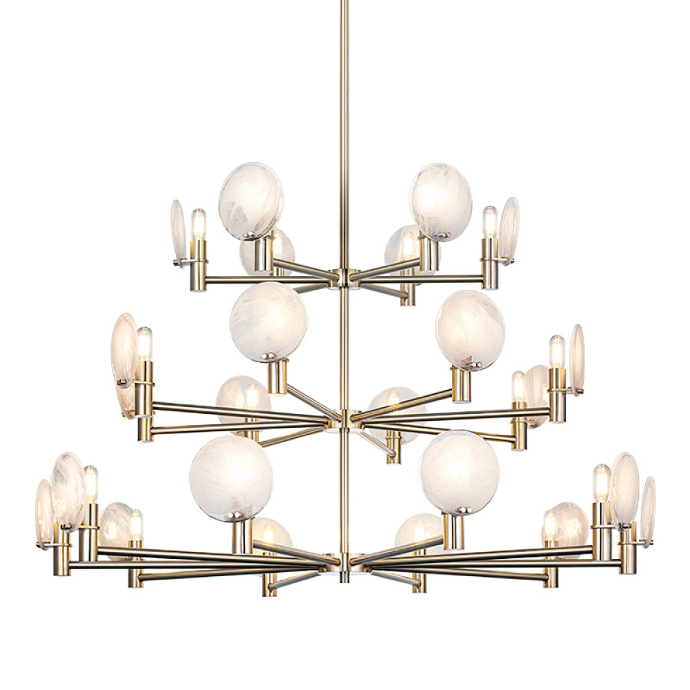 This chandelier blends mid-century modern with space-age sophistication ideal for upscale dining rooms, creative studios, or hospitality spaces aiming for an artistic edge.This can be shown with the light emitting up or down.The cloudy swirl glass gives it a soft touch to the design.