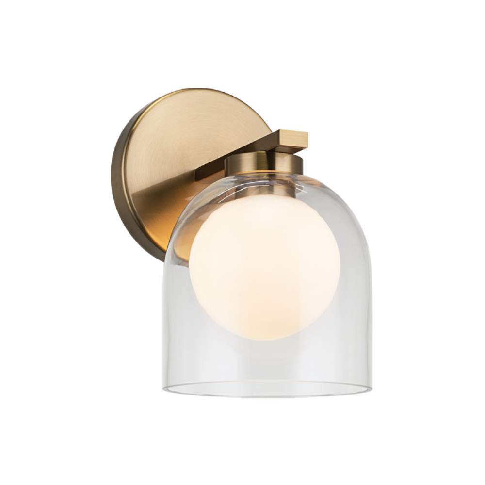 Derbishone, a striking vanity series with graceful dome shaped clear glass. Available in 4 different sizes and 2 finishes: Aged Gold Brass or Black. Charming addition to room.