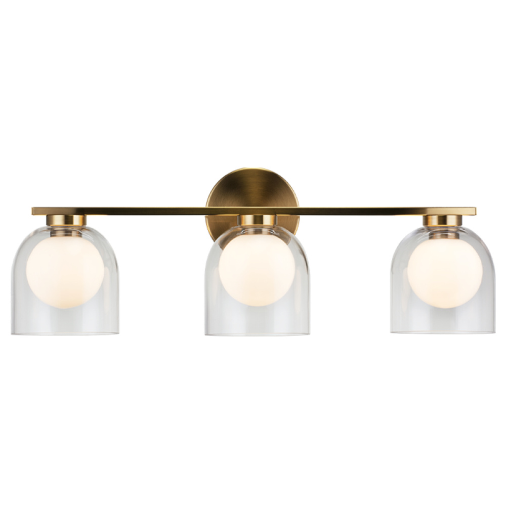 Derbishone, a striking vanity series with graceful dome shaped clear glass. Available in 4 different sizes and 2 finishes: Aged Gold Brass or Black. Charming addition to room.