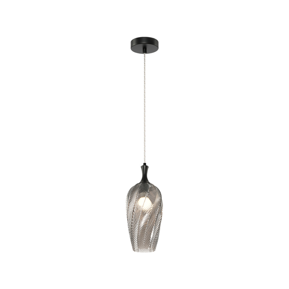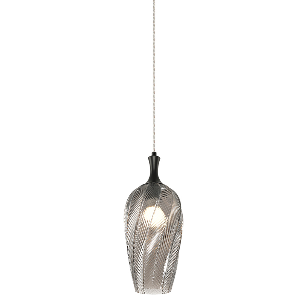 A single pendant in a Smoked or Amber-shaded glass, the Eesha would have a beautiful, organic look with a warm ambient glow. The design is crafted to resemble a softly curving leaf with delicate veins. Comes in 3 different shaped glass.