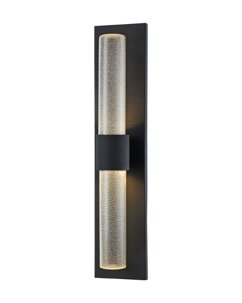 Likwid is a simplistic yet sophisticated wall mount series. Offered in an elegant Matte Black finish combined with a seeded water look glass shade. An LED non visible light source completes the style making it not only a beautiful piece but practical as well. It can be place in both dry and damp locations.
