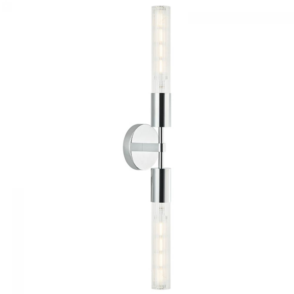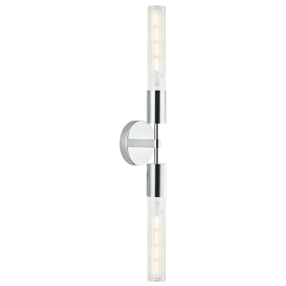 The Lumie?re is a modern wall vanity in an Aged Gold Brass or Matte Black socket and round backplate complemented by ribbed glass. Available in single or 2 light.