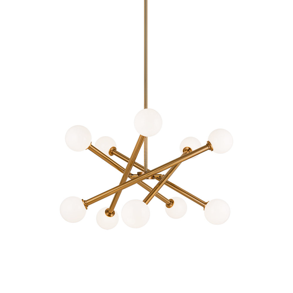 Matchstix chandelier will be a dramatic addition to any room. Modern movement in the crossing bar design will be a signature piece. Available in Aged Gold Brass or Black with either Clear or Opal glass.