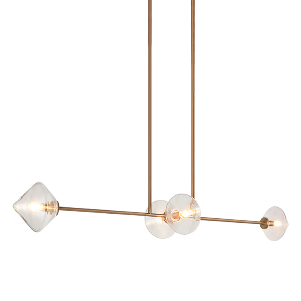 Novo is modern yet classic – available in the form of chandelier, wall sconce, and flush mount. The rods and base are either Aged Gold Brass or Black finish paired with a contrasting Opal or Clear round glass and diamond shaped glass. The style is very versatile and will add beauty to multiple rooms.