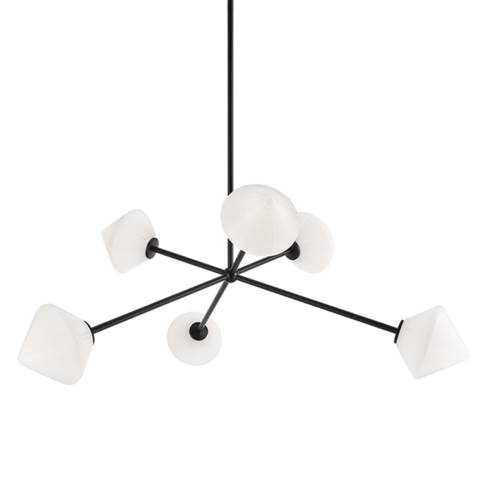 Novo is modern yet classic – available in the form of chandelier, wall sconce, and flush mount. The rods and base are either Aged Gold Brass or Black finish paired with a contrasting Opal or Clear round glass and diamond shaped glass. The style is very versatile and will add beauty to multiple rooms.