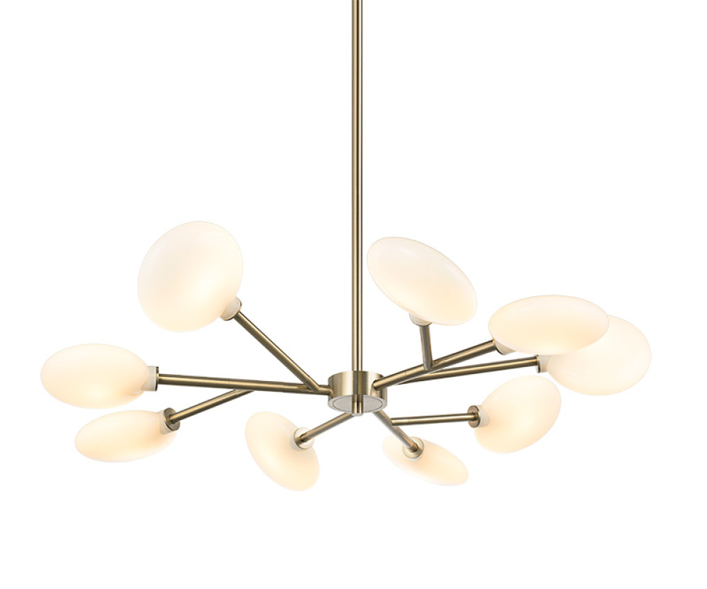 Peony A modern masterpiece with timeless warmth, this chandelier introduces contemporary sophistication through its radiant, pebble-shaped opal glass shades arranged in a striking starburst formation. The larger glass elements echo the sculptural beauty of our Hydrangea series. Each opal diffuser casts a soft, inviting glow, balancing ambience with artistic presence. Available in Champagne Gold or Matte Black finishes. LIGHTBULBS NOT INCLUDED