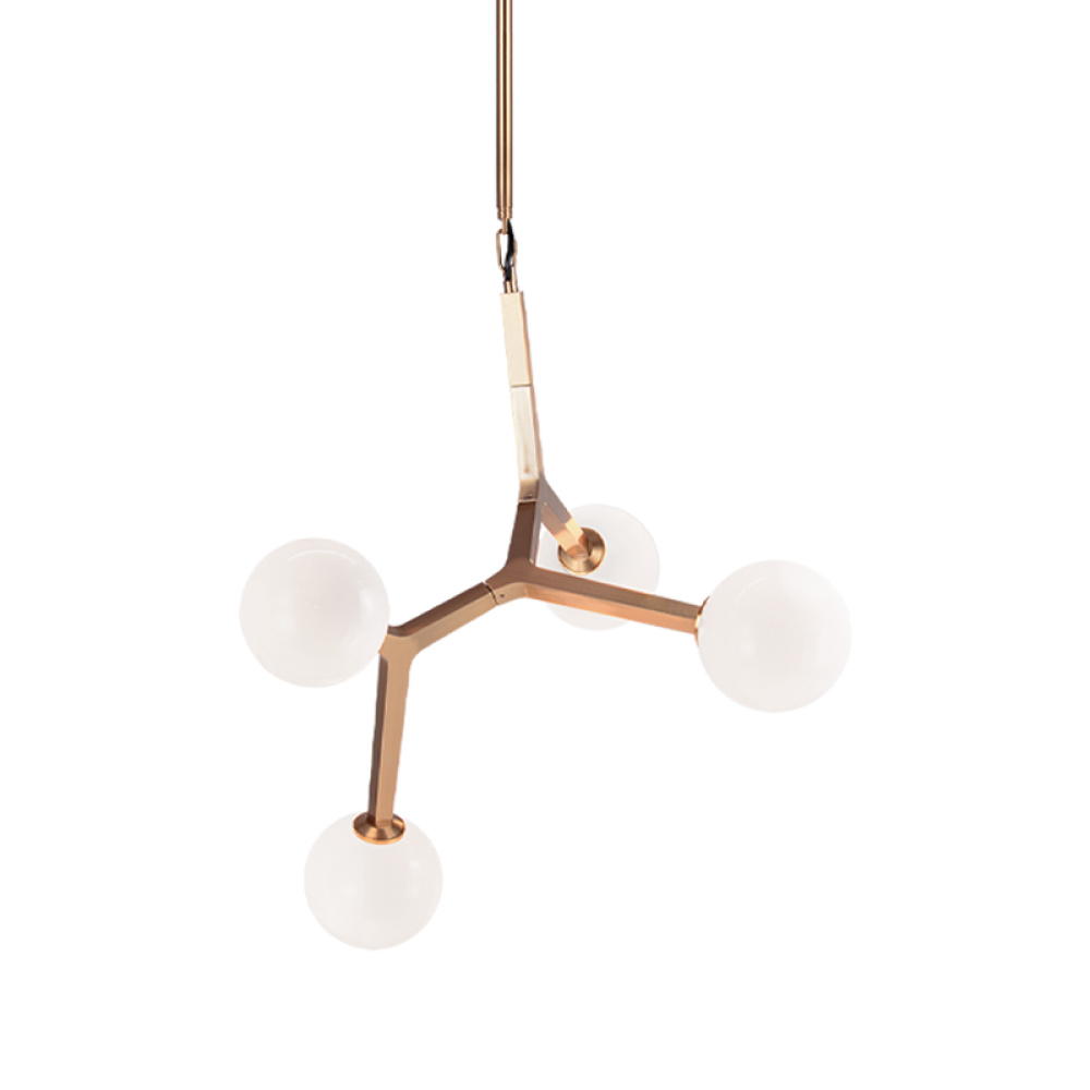 A mid-century inspired series that features branch-like elements with attached Opal Glass. The Rami is a stylish and graceful design that will bring refinement to any room. Available in the form of chandelier, wall sconce, and flush mount