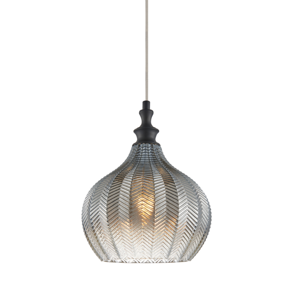 The Renity series features an elegant design of chevron textured glass, matched with either Aged Gold Brass or Smoke finish.These sophisticated pendants will add charm to any space. Available in 2 glass shapes.