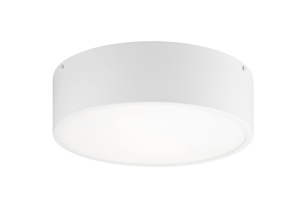 A classic round flush mount offered in two sizes and four finishes. Straight sided round metal bands finished in Aged Gold Brass, Bronze, Chrome or White completed with a frosted glass lens.