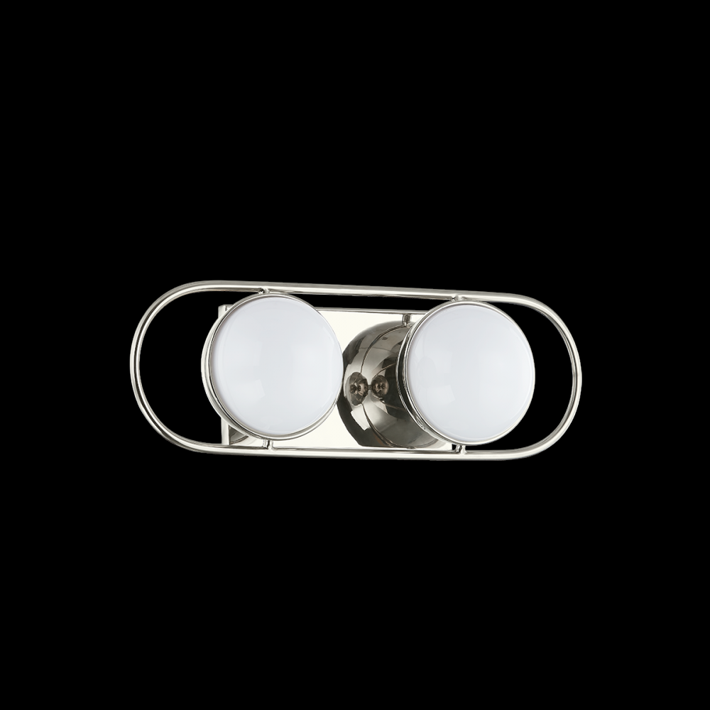 Opal glass spheres are held gem-like within a Polished Nickel or Aged Brass setting, bringing a modern jewelry aesthetic to the bath or powder room. The two-, three-, and four-light options are displayed within an elegant metal racetrack frame and can be mounted vertically or horizontally making them perfect solo above a mirror or in pairs alongside it.