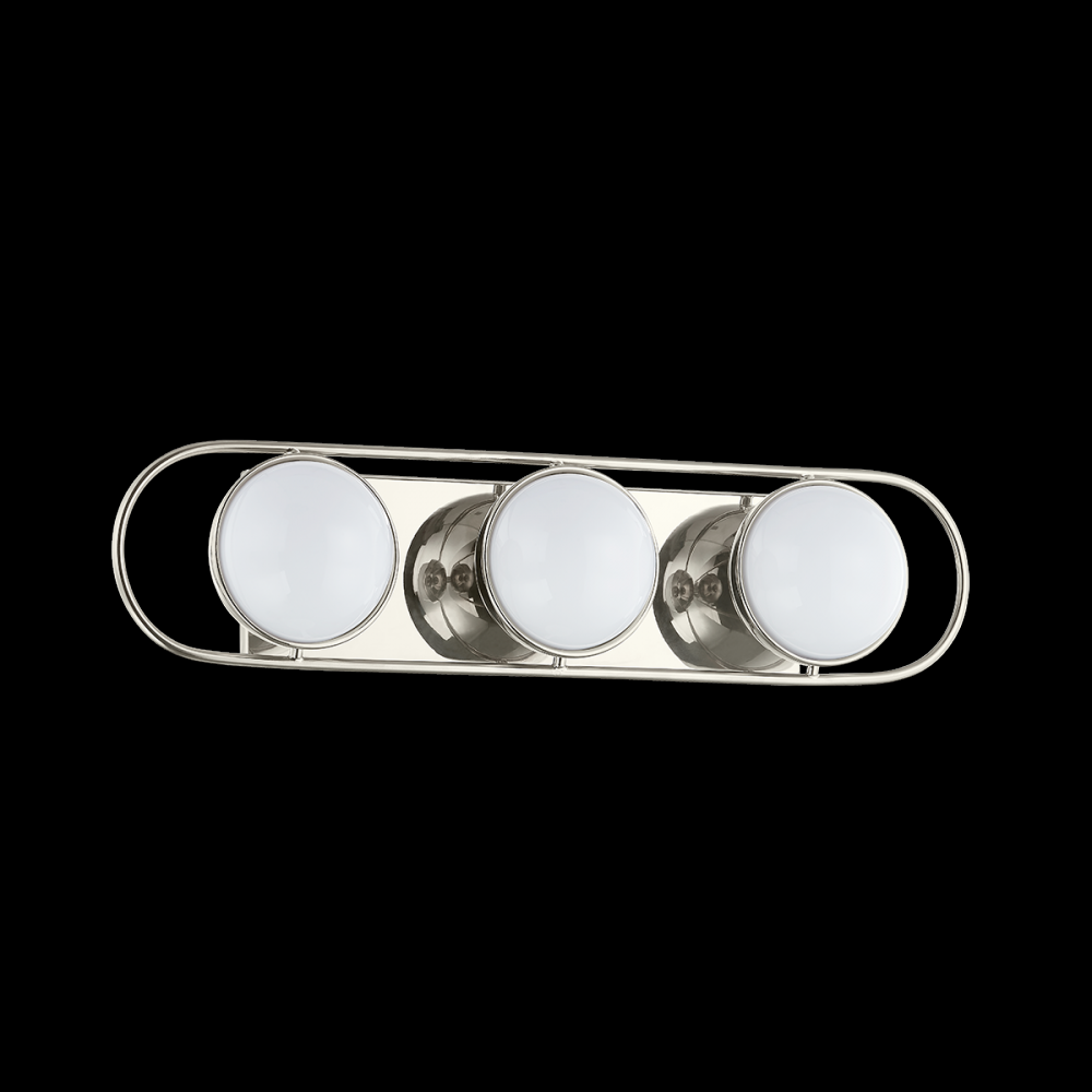 Opal glass spheres are held gem-like within a Polished Nickel or Aged Brass setting, bringing a modern jewelry aesthetic to the bath or powder room. The two-, three-, and four-light options are displayed within an elegant metal racetrack frame and can be mounted vertically or horizontally making them perfect solo above a mirror or in pairs alongside it.