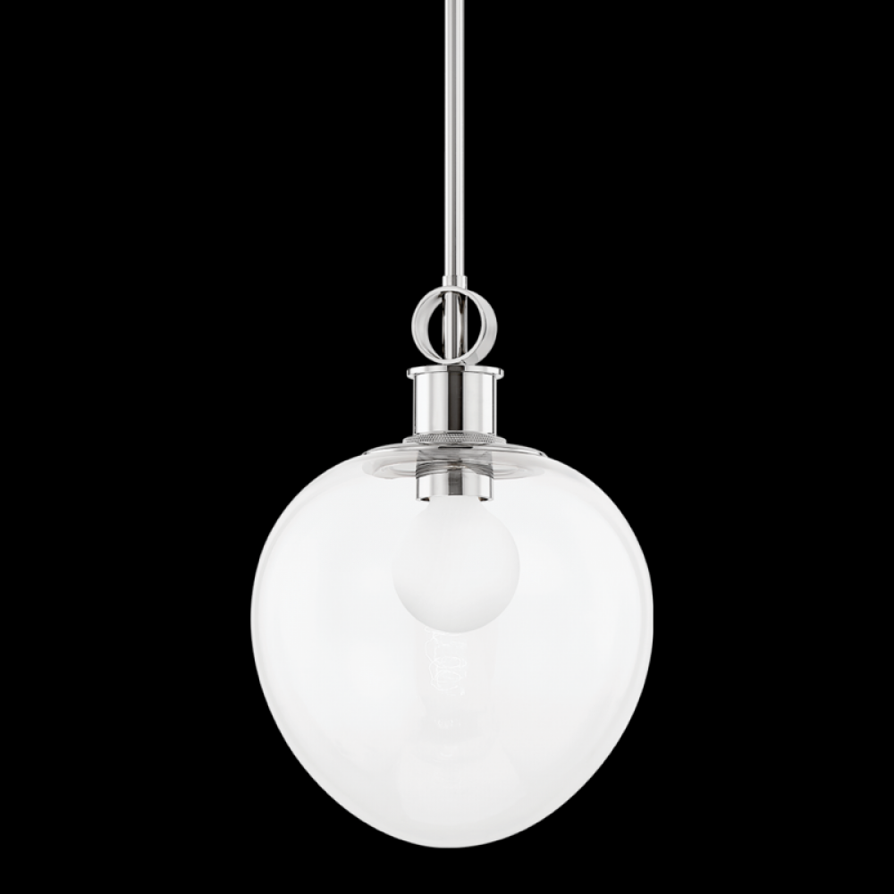 Simple yet savvy, the Anna Pendant is a modern classic that will work in any space. A linear, polished nickel or aged brass pipe drops down to reveal an oval glass dome housing a single light source. Also available in a larger size.