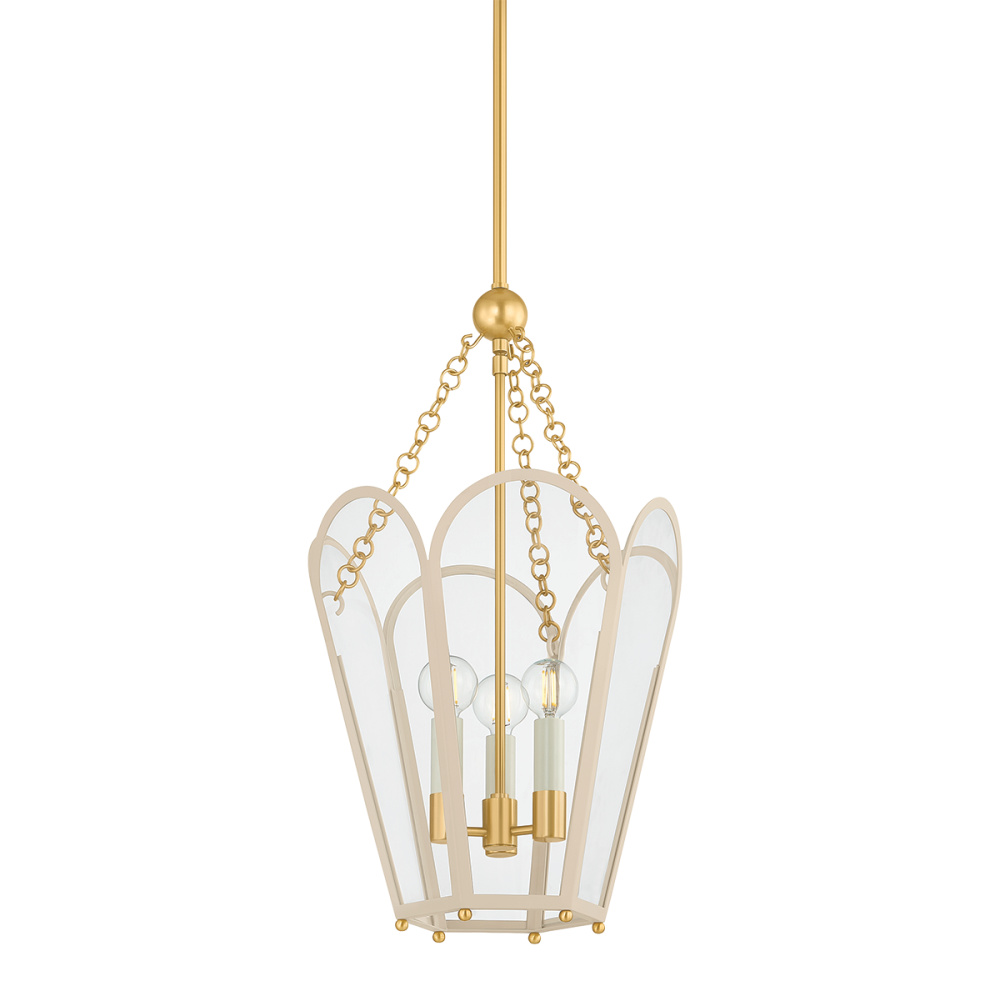 A classic lantern shape is reimagined with the spirit of modern romance. The hexagonal frame of Clarisse features arched glass panels that reveal cream candles. With a mix of Aged Brass and either Soft Bisque or Arctic Ocean finishes, each lantern is a festive celebration of color. Available as a small 3-light or large 4-light design.