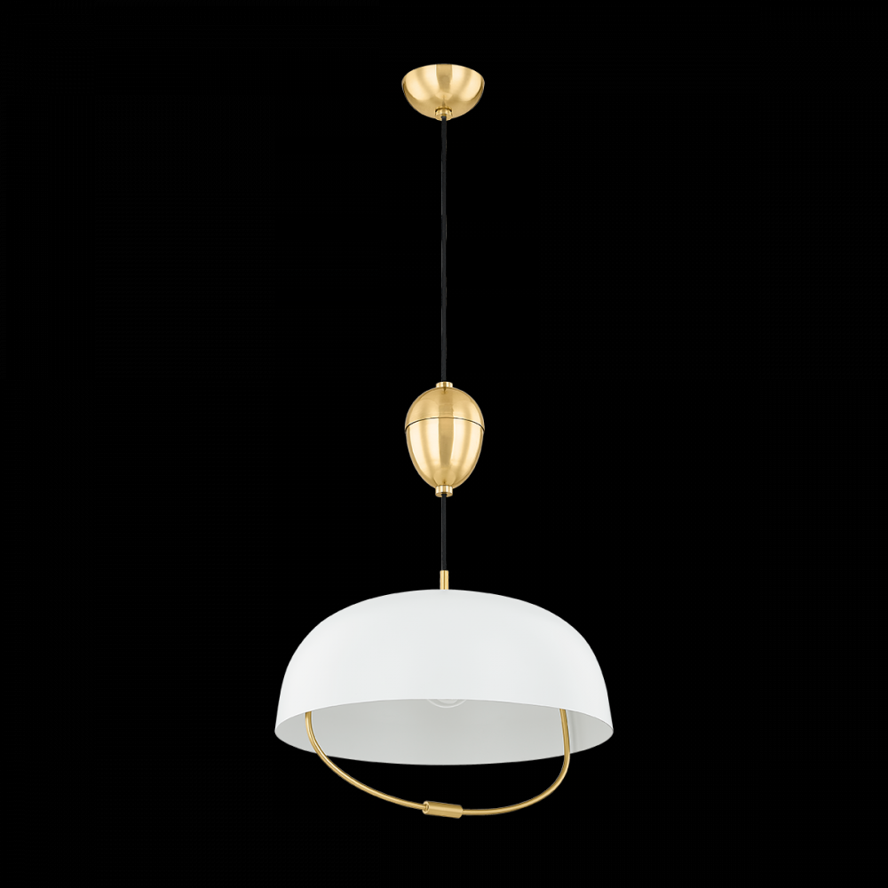 Simplified and serene, this rise-and-fall pendant draws from timeless design motifs. Inspired by the shape of a basket, the soft white dome shade is complemented by curved metal details. Equally beautiful as it is practical, this pendant can be simply adjusted to any height using the delicate gold handle, making it ideal for task-oriented settings. Finished in Aged Brass, Lilianna provides gentle illumination in both traditional and modern settings.