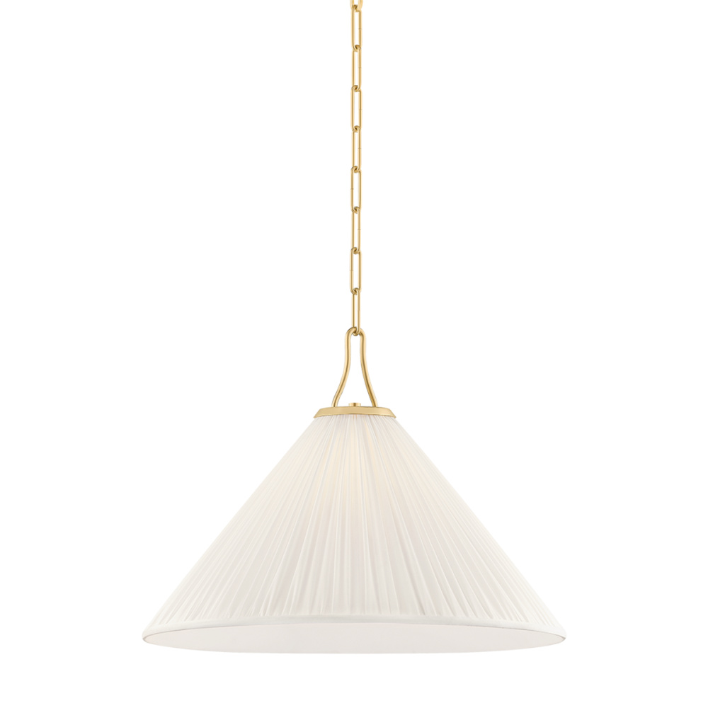 Elegant in its simplicity, the Merida pendant pairs a pleated faux silk shade with crisp metalwork. A sleek racetrack loop extends from the top of the fixture, its elongated shape seeming to be drawn downward by the weight of the shade. Finished in Aged Brass, this special detail and classic chain add a clean modern touch to the design. Available in two sizes.
