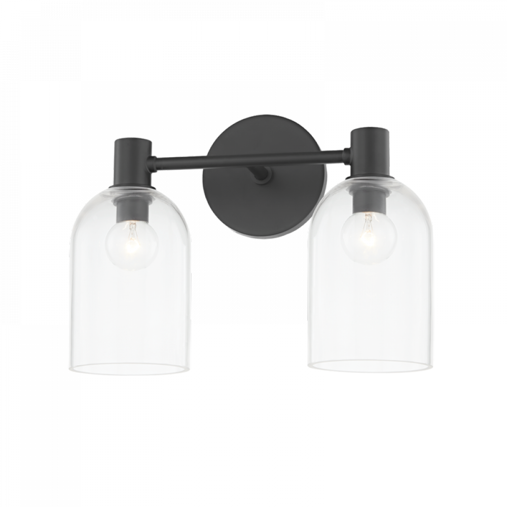 Drawing inspiration from antique glass bottles, a cloche-like shade in clear glass showcases a single bulb nested at the top of the glass. A simple metal arm, circular backplate and cylindrical holder add to Paisley's crisp, clean look. While the two- and three-light options are an obvious choice for the bath, the single-light sconce would also work well in a hallway or beside a fireplace or window.