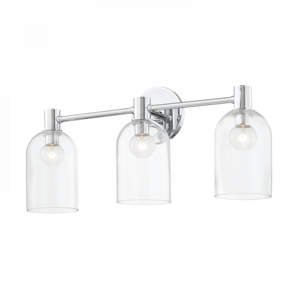Drawing inspiration from antique glass bottles, a cloche-like shade in clear glass showcases a single bulb nested at the top of the glass. A simple metal arm, circular backplate and cylindrical holder add to Paisley's crisp, clean look. While the two- and three-light options are an obvious choice for the bath, the single-light sconce would also work well in a hallway or beside a fireplace or window.