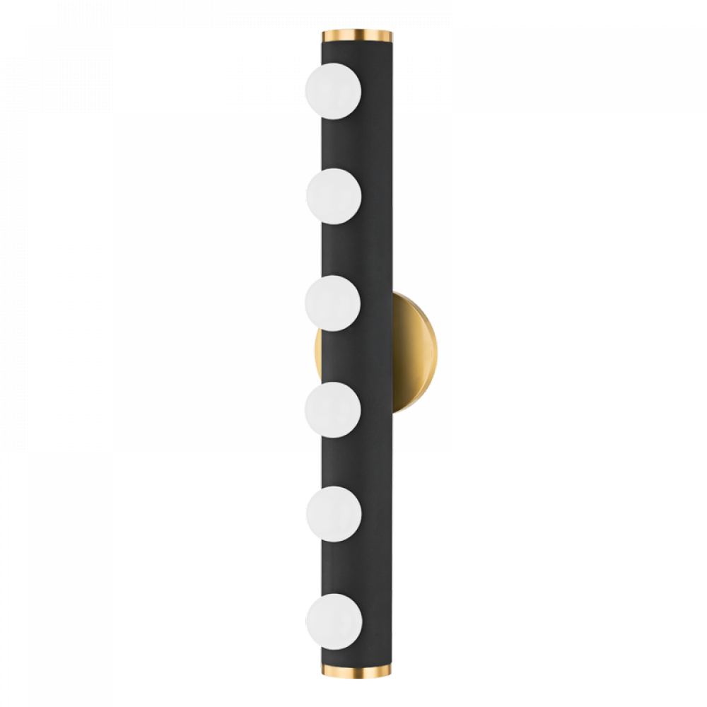 Penny gives familiar Hollywood-style lighting a fresh feel. Small opal matte globes spread across a cylinder of textured white or textured black for a glamorous look that provides ample bright light. An aged brass backplate and decorative end caps give the fixture a fun, updated look. With the ability to mount horizontally or vertically, Penny makes perfect sense over or alongside the vanity in the bath.