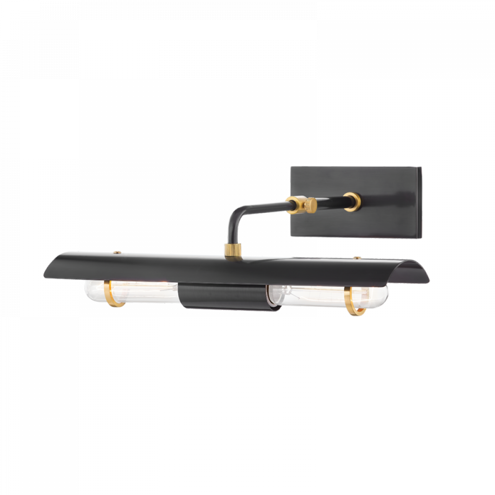 Raelynn is a fresh and fun take on a traditional picture light. A telescoping arm and a rotating reflector provide amazing adjustability to cast just-right light on artwork or photographs. Mechanical hardware details like the metal rings around the bulbs and the knurled hardware elevate the design. Available in aged brass or a two-tone aged old bronze finish.