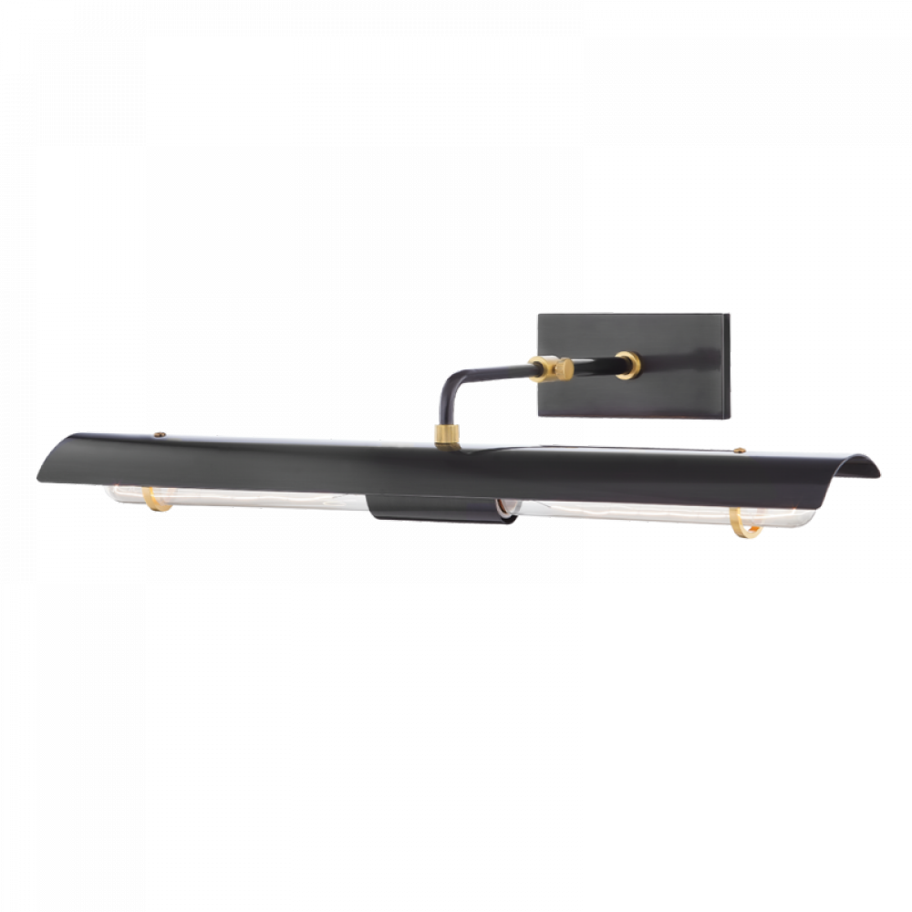 Raelynn is a fresh and fun take on a traditional picture light. A telescoping arm and a rotating reflector provide amazing adjustability to cast just-right light on artwork or photographs. Mechanical hardware details like the metal rings around the bulbs and the knurled hardware elevate the design. Available in aged brass or a two-tone aged old bronze finish.