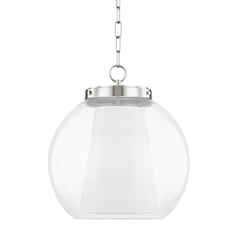 A chain cord, metal finish canopy and unique shade-within-a-shade design make this Sasha totally fierce. A white, Belgian-linen, cone-shaped shade is covered by a clear glass globe shade to emit a soft glow that shines bright. With two pendant sizes in three finishes (Aged Brass, Old Bronze and Polished Nickel) there's something for every space and taste.