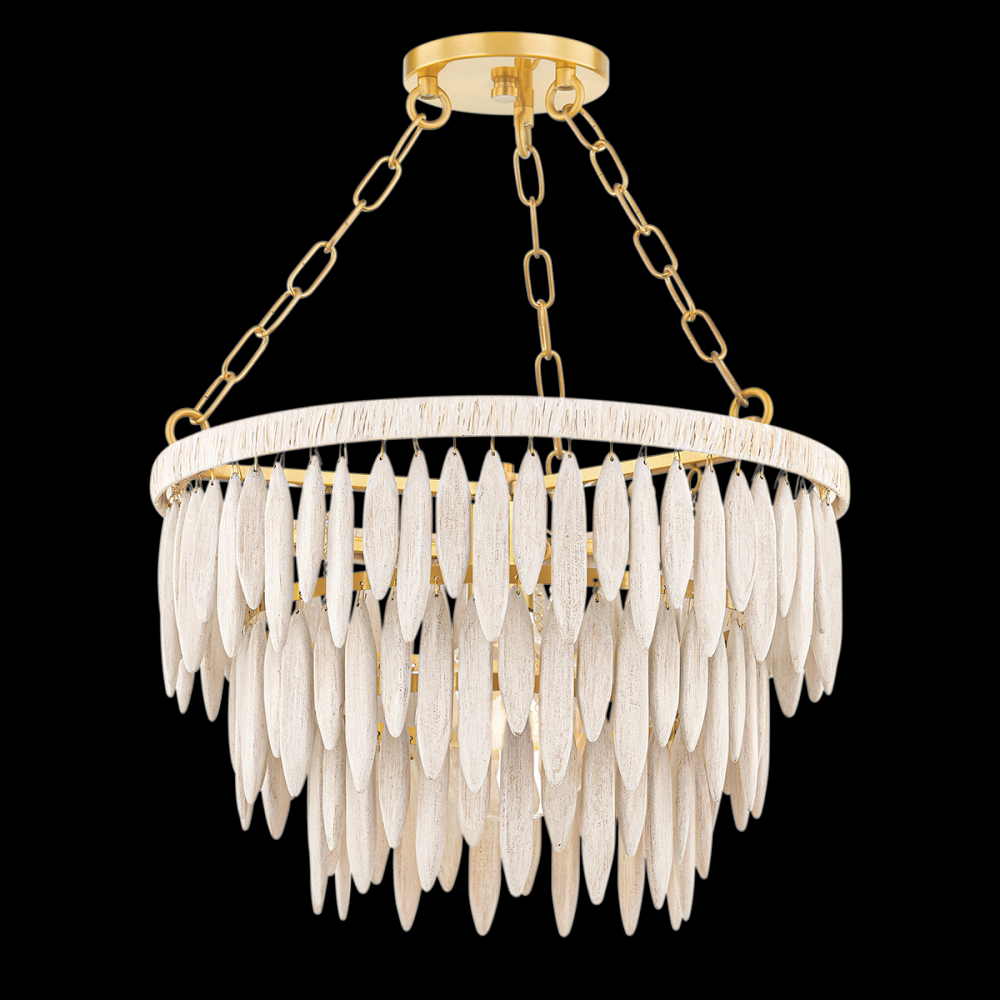 This elevated organic design blends soft natural elements with an elegant, sculptural form. A series of elongated white-washed wood beads are arrayed in tiers around an Aged Brass framework. The top ring of the frame is wrapped in white raffia adding to the clean, fresh feel. The neutral tone makes it the perfect way to add an organic, coastal vibe to a space. Available as a semi-flush, pendant, and chandelier.