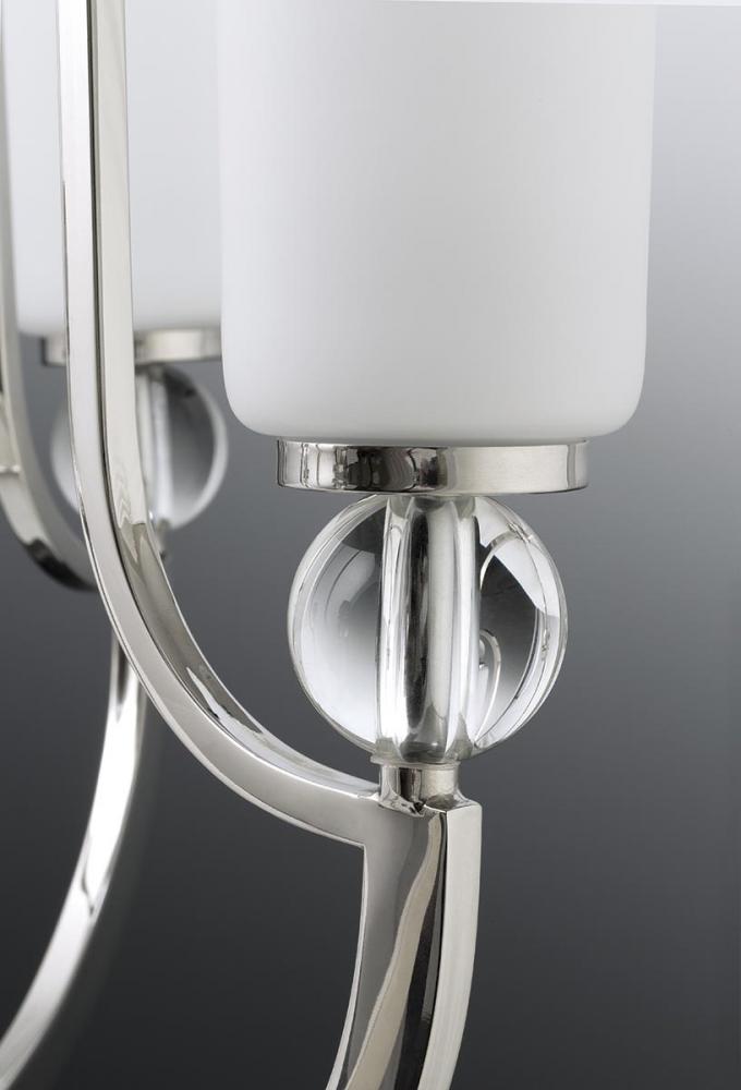 The seven-light chandelier from the Elina Collection spins a traditional classic and modern form by exaggerating its heirloom quality details. The fixture's tall, trumpeted opal glass, K9 glass orb accents and polished nickel finish create the distinctive silhouette.