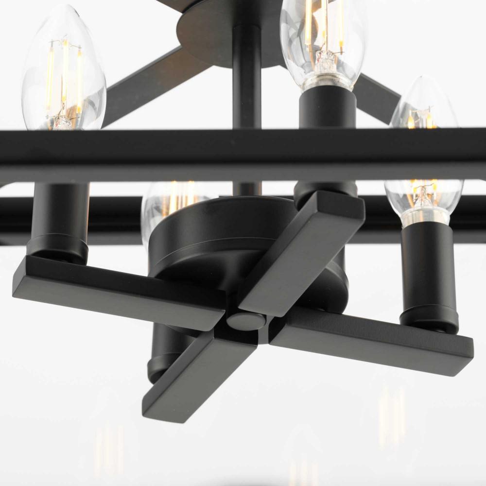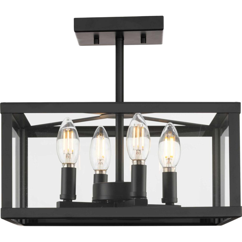 The Hillcrest Semi-Flush Light interprets the traditional carriage light for the modern age, giving it a fresh update with a refined angular silhouette. A classic candelabra base is suspended within a clear beveled glass frame.Clear illumination is cast from its airy design.