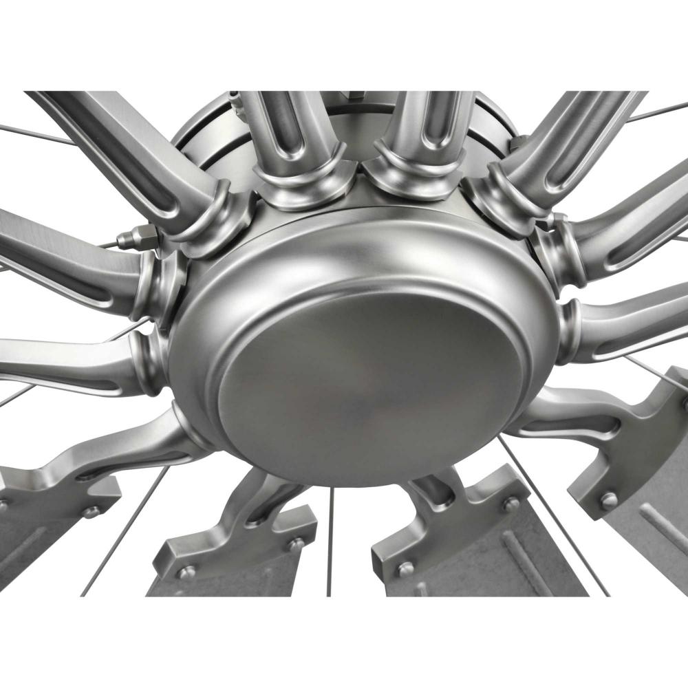 The fan is finished in antique nickel, showcasing the fixture's expansive modern design with twelve galvanized finish aluminum blades