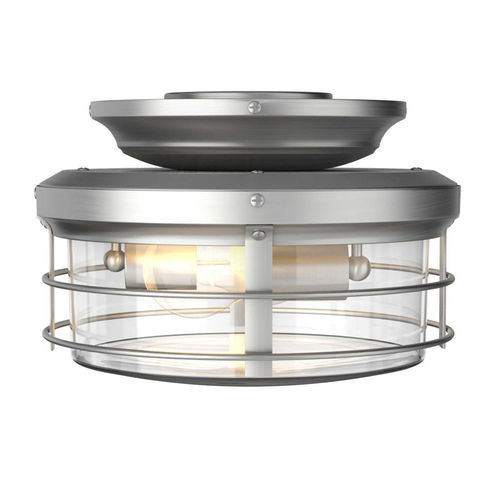An open cage frame surrounds two ST19 bulbs in the rustic design of the Springer II Light Kit. As the sun goes down, this piece is ideal for entertaining under the circulating air of your Springer II ceiling fan. Damp listed for use inside or in covered outdoor areas, this light kit provides beautiful ambient illumination to bedrooms, living rooms, porches and patios infarmhouse, rustic, and coastal style settings. Its vintage style light base is coated in a subtle Antique Nickel finish.