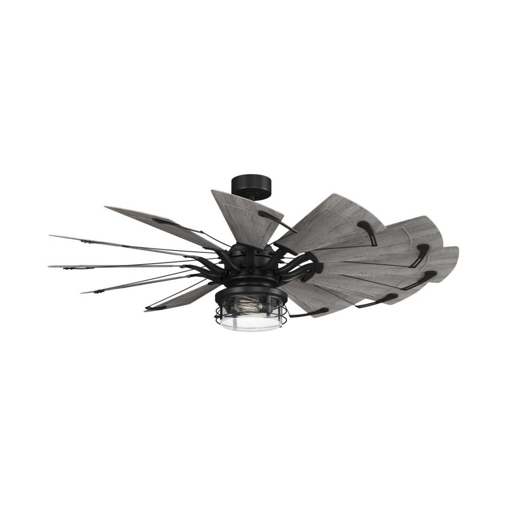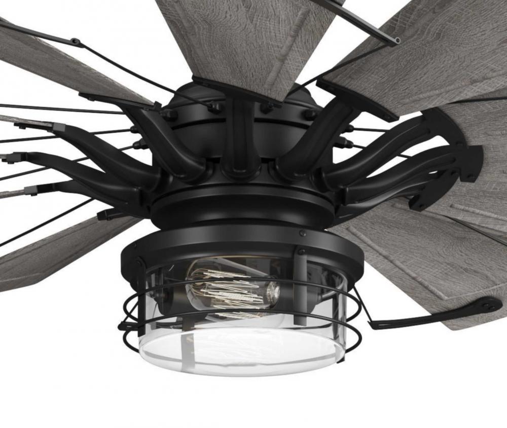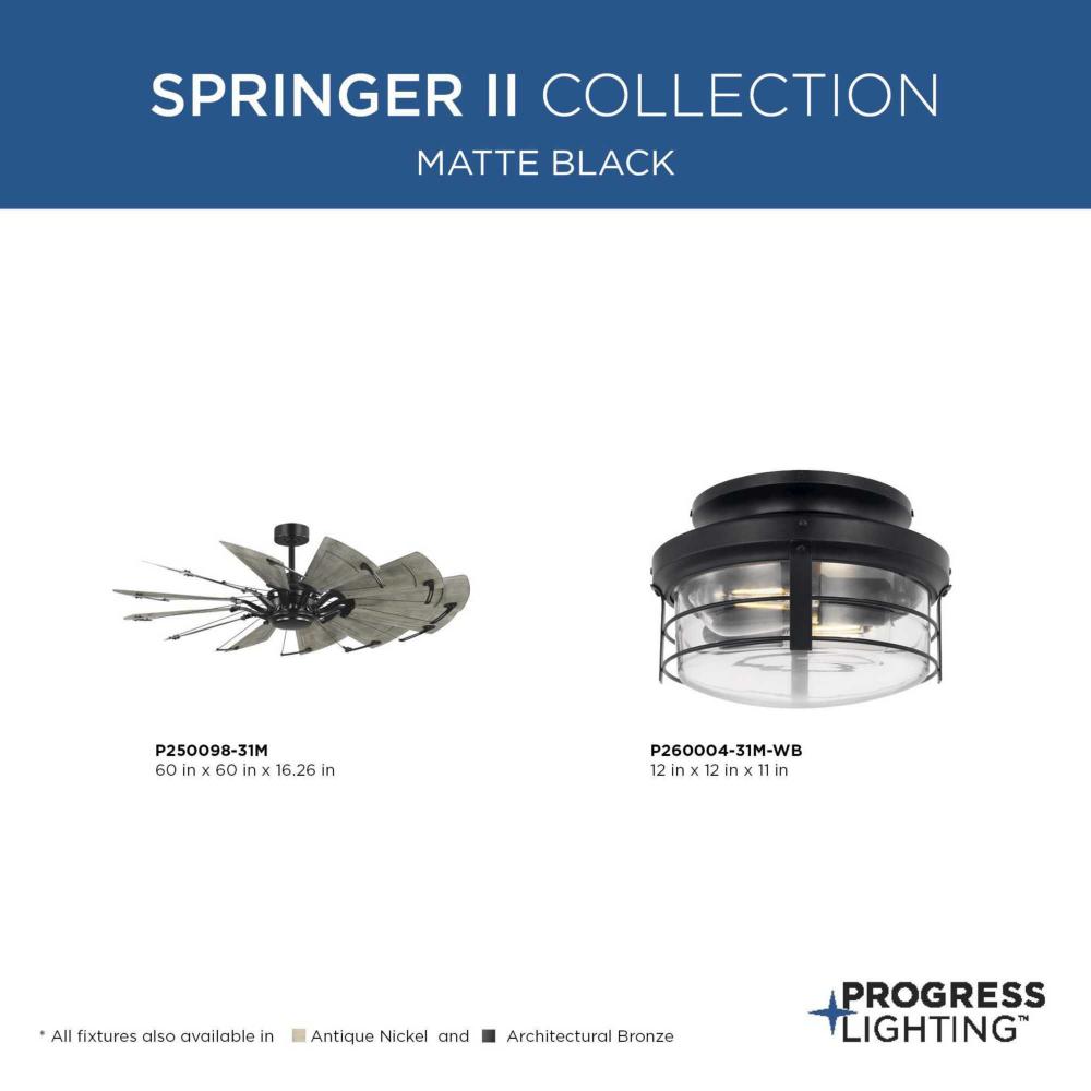 An open cage frame surrounds two ST19 bulbs in the rustic design of the Springer II Light Kit. As the sun goes down, this piece is ideal for entertaining under the circulating air of your Springer II ceiling fan. Damp listed for use inside or in covered outdoor areas, this light kit provides beautiful ambient illumination to bedrooms, living rooms, porches and patios infarmhouse, rustic, and coastal style settings. Its vintage style light base is coated in a crisp Matte Black finish.