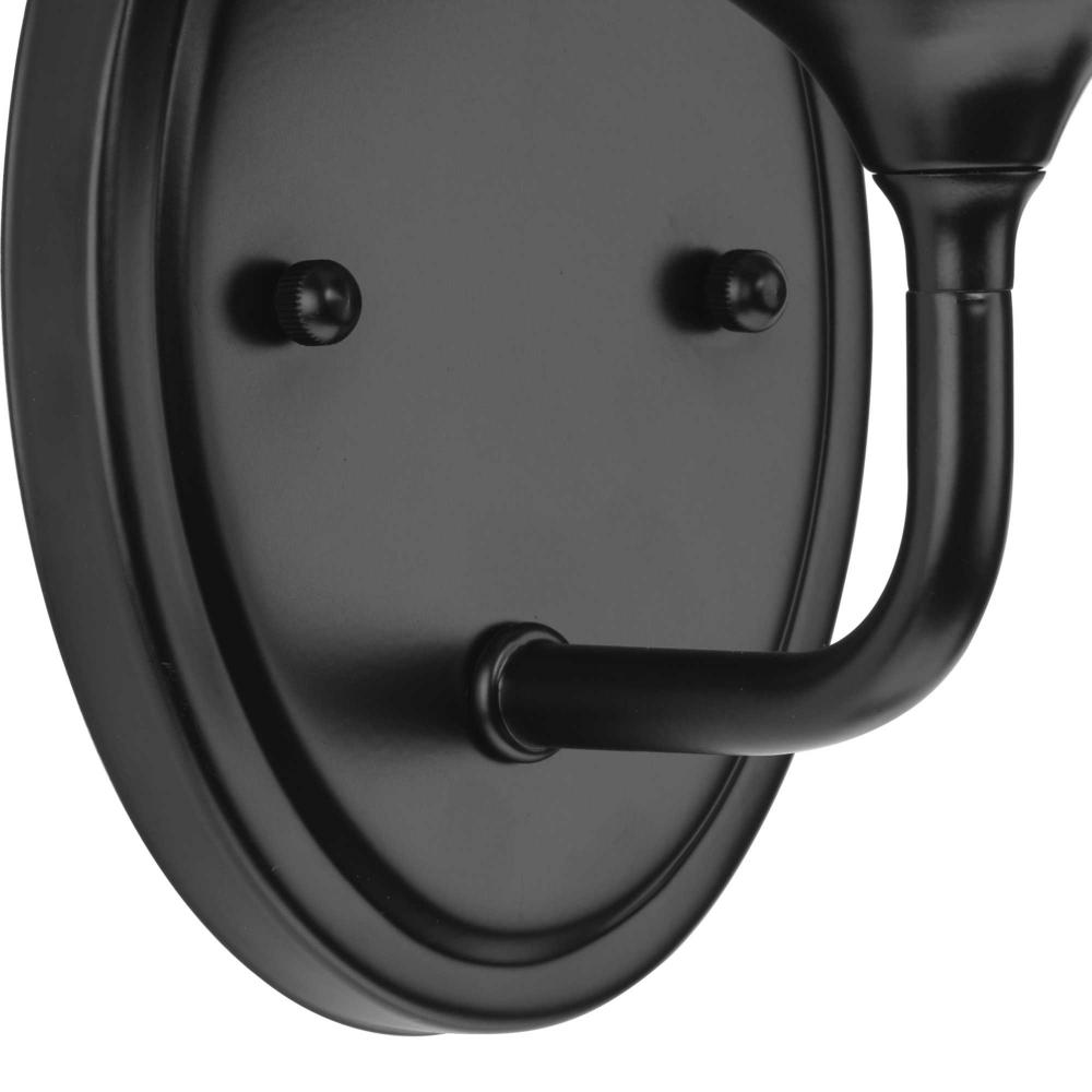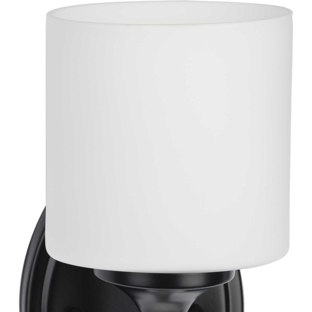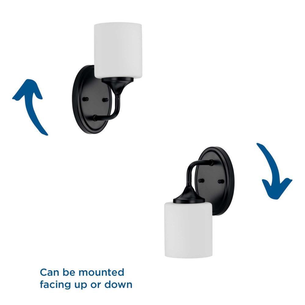 With a youthful, yet timeless flair, the Lynzie Collection brightens your day with its elegant form. An etched white, oval shaped glass shade is held upright by a delicate arm attached to a classic oval backplate coated in a matte black finish. Uncluttered and simple lines depict the gracefulness of this bath vanity collection and add visual interest without complexity. Ideal for a bathroom, hallway, or foyer in modern and transitional style settings, this versatile design can be mounted with the glass facing up or down for more design flexibility.