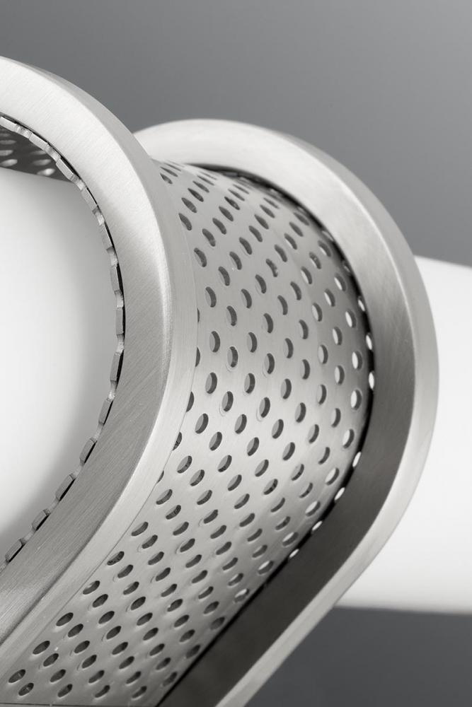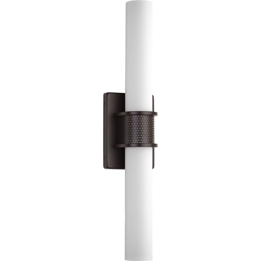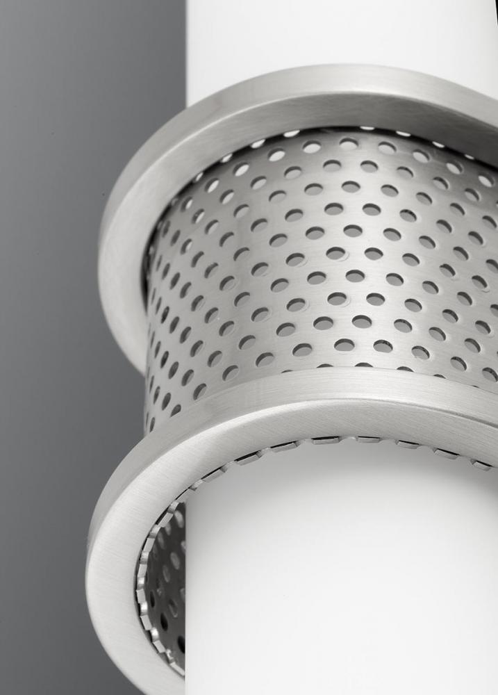 Tubular design pairs with a geometric back plate and mesh accents.;Can be mounted horizontally or vertically.;Circular etched opal glass contains an integrated LED source.;Dimmable to 10% with many ELV dimmers;1443 lumens 38 lumens/watt (delivered);3000K