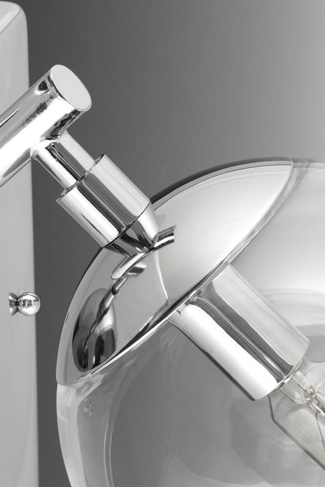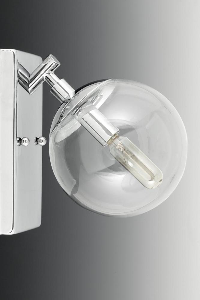 Giving a nod to the space age with mid-century modern appeal, Mod features a sleek linear frame in a Polished Chrome finish. Clear, spherical glass shades offer the perfect focal point for vintage bulbs or reflector-style globes. This one-light fixture can be used in the bath and vanity or as a complimentary wall sconce.