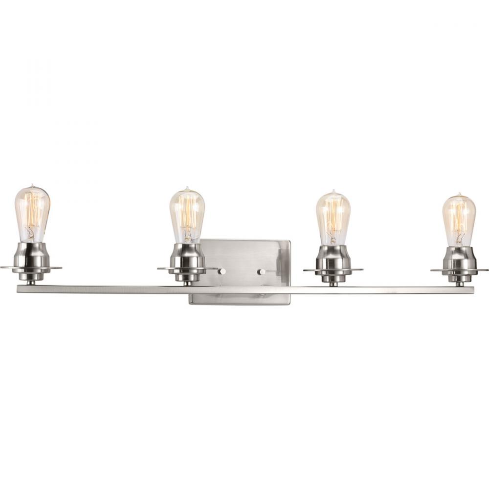 Ideal for a bathroom;Perfect for farmhouse and urban industrial style settings;Beautiful brushed nickel finish;Glass accessory shades available in clear or frosted seeded finishes;Mount the light fixture facing up or down;Use 4 medium base bulbs that are s
