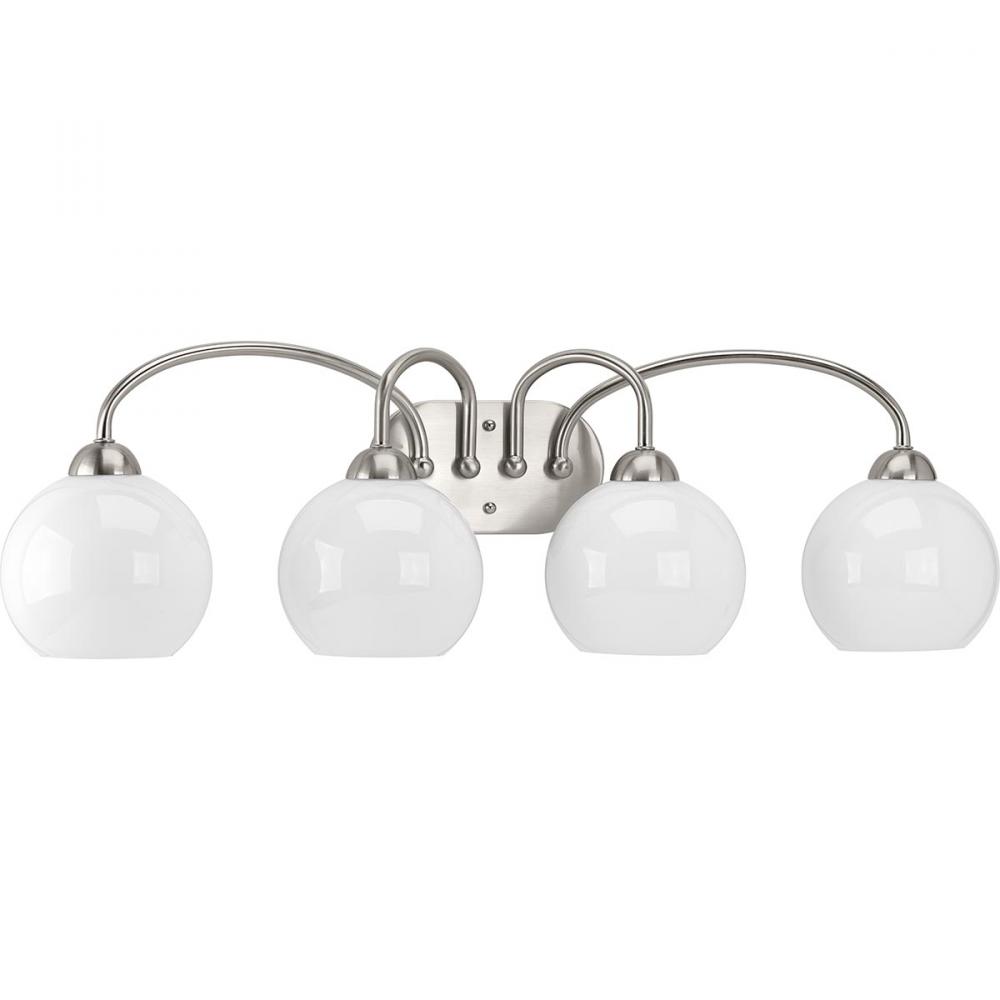 Ideal for a bathroom;Perfect for mid-century modern and modern style settings;Beautiful brushed nickel finish;Elegant opal glass shades;Mount the light fixture facing up or down;Use 4 medium base bulbs that are sold separately (75 W max - LED/CFL/incandesc